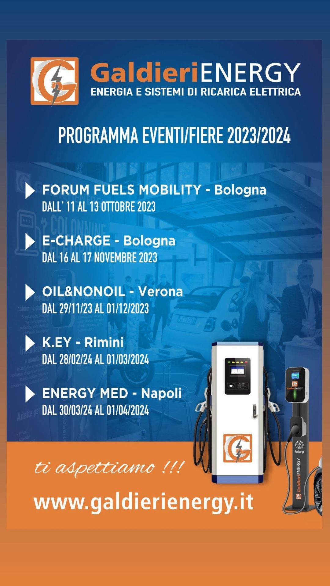 Già pronta la programmazione dei prossimi eventi ai quali Galdieri Energy parteciperà da ottobre fino alla prossima primavera. Una serie di fiere e di eventi che ci consentiranno di girare l’Italia prendendo parte attiva agli appuntamenti più rappresentativi del settore della mobilità sostenibile.