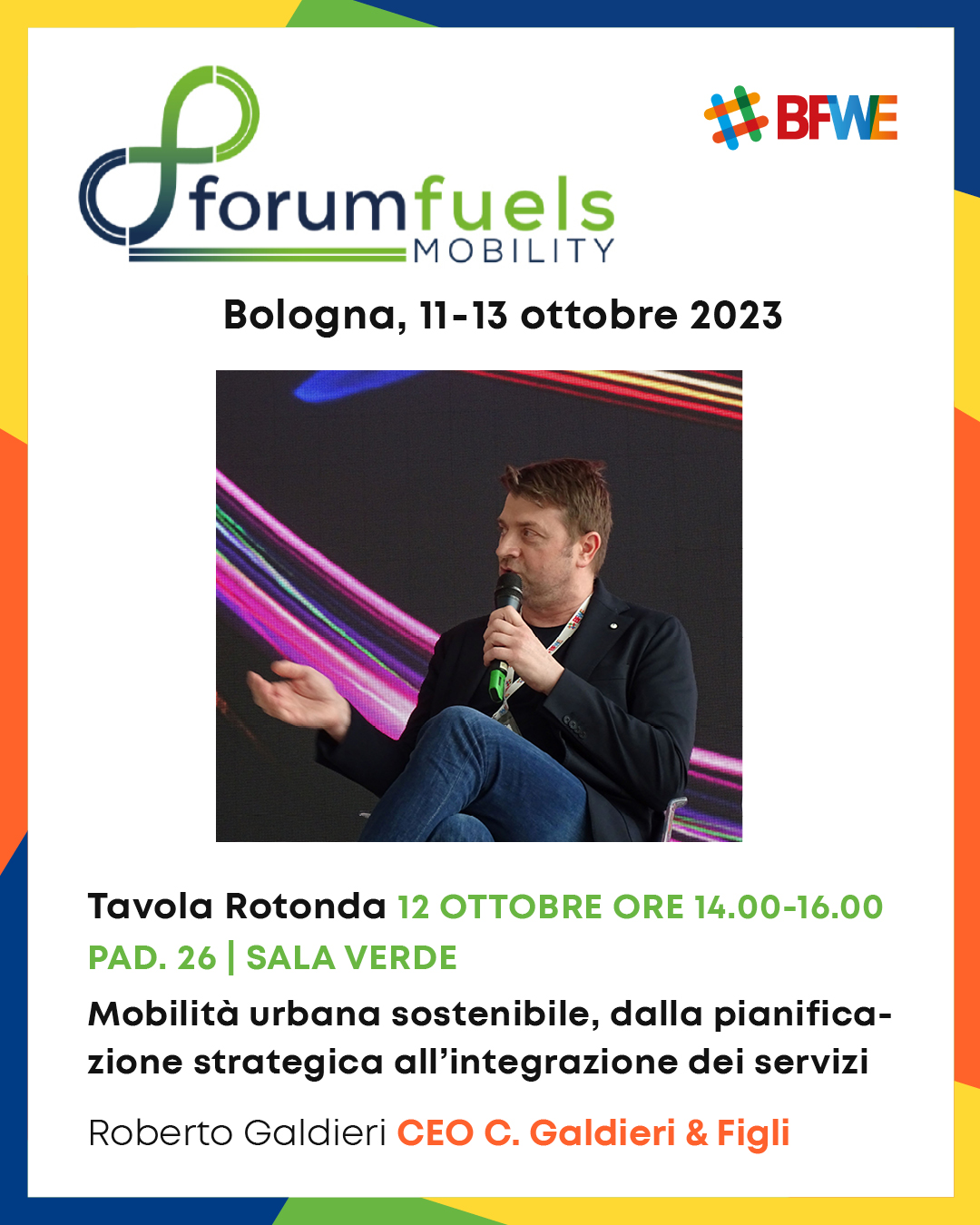 Nel corso del Forum Fuels Mobility, il CEO dell’azienda, Roberto Galdieri, parteciperà alla tavola rotonda del 12 ottobre dal titolo “Mobilità urbana sostenibile, dalla pianificazione strategica all’integrazione dei servizi”. Porterà ad esempio la propria esperienza nel contribuire alla costruzione della rete di infrastrutture necessaria a dare una spinta decisa all’adozione della mobilità elettrica.